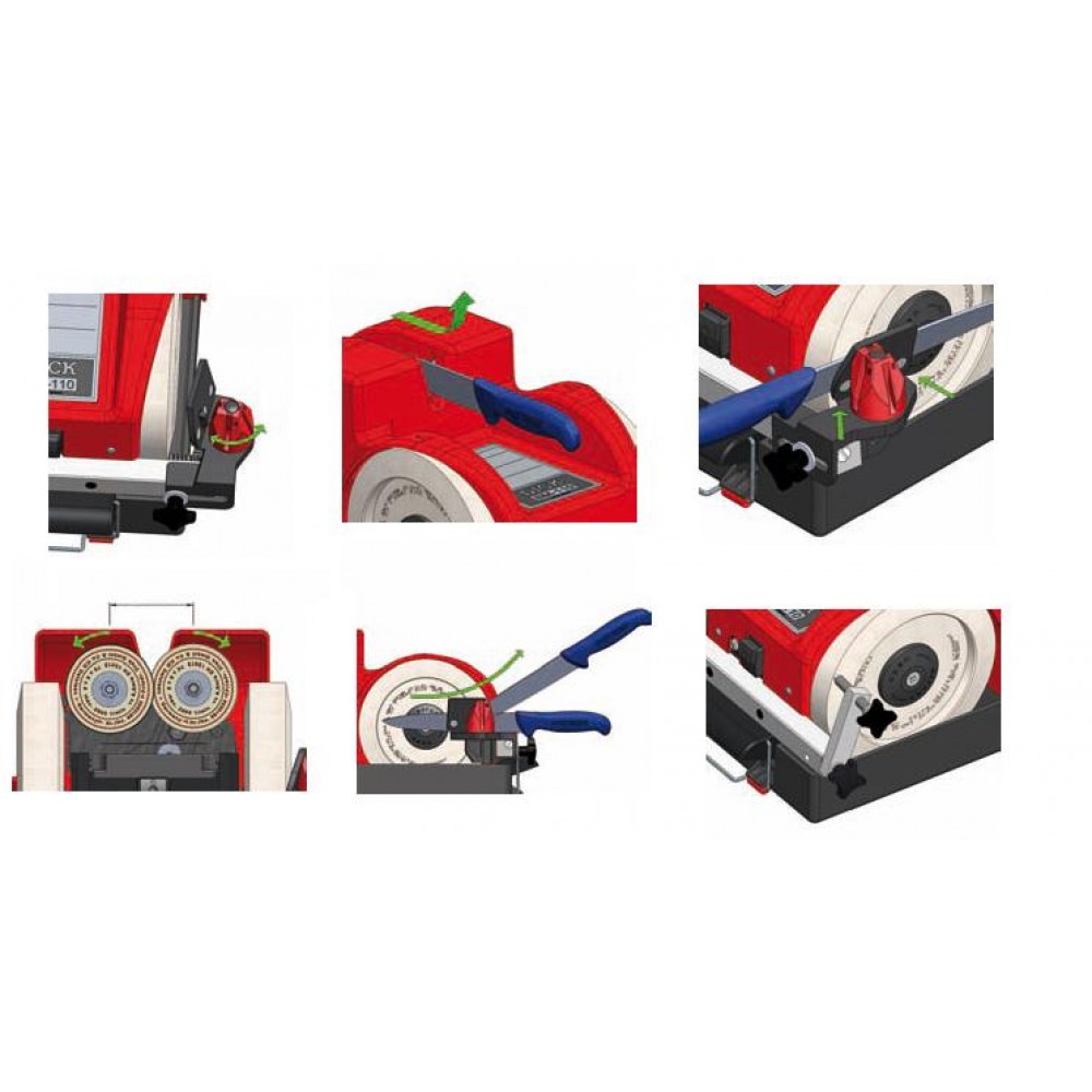 üç aşamalı bir bileme aleti, önce sulu sistemli yan disklerle açıyı ayarlayarak biliyorsunuz, sonra üstteki bilemeyle ikinci açıyı oluşturuyorsunuz. En sonunda da dikey diskle parlatıyorsunuz.