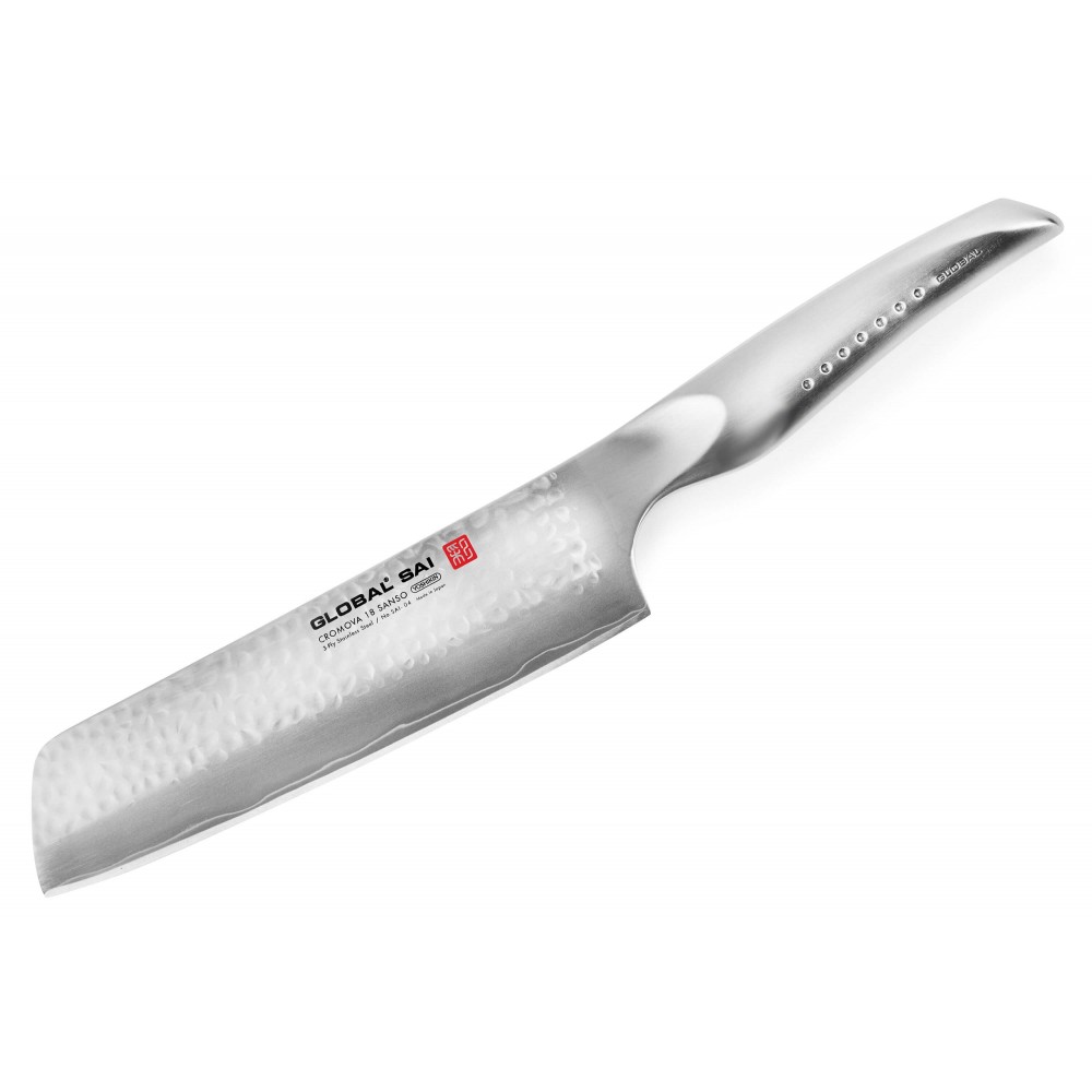 Global Sai Aşçı Bıçağı, ince doğramadan küp küp doğramaya ve kağıt gibi ince dilimlemeye, sarımsak kıymaya, kereviz küp küp doğramaya, domates dilimlemeye ve daha fazlasına kadar çok çeşitli kesme görevlerini yerine getirir. Global Sai Bıçakları, Yoshikin'in Japonya'daki fabrikasında yetenekli Japon ustalar tarafından aynı şekilde yapılan Klasik Global Bıçaklarla aynı geleneği takip eder. Sap tasarımı tamamen yenidir ve kesme hareketini kolaylaştırmak için ergonomik bir başparmak desteği eklenmiştir. Bıçaklar, iki kat SUS410 paslanmaz çelik malzeme arasına sıkıştırılmış özel Cromova 18 Sanso paslanmaz çelik kullanılarak 3 katmanlı bir yapı ile üretilmiştir. Bıçaklar, bıçağın ufalanmaya, paslanmaya ve lekelenmeye karşı korunmasına yardımcı olan üstün kesme performansı sağlamak için ince bir kesici ağız bilenmiştir. Bıçağın kenarlarına hava cepleri oluşturan dövülmüş bir yüzey buulunur, bu da kesilen yiyeceğin daha iyi salınmasını sağlayarak bıçağa yapışmaz özellikler kazandırır. Japonya'da samuray kılıcı geleneğini, modern teknoloji ile zanaatkar teknikleri kullanılarak el işiçiliği ile üretilmektedir.