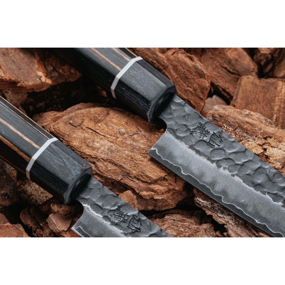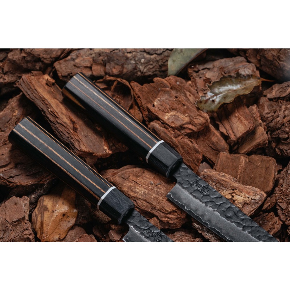 En yeni ve en iyi toz çelik olan SPG STRIX®, 65 HRC sertliğinde mükemmel keskinliğe ulaşan bıçak için kullanılır. Aynı zamanda, alaşımın özel yapısı nedeniyle bileme taşı ile yeniden keskinleştirilmesi mümkün hale gelir. Bıçak yüzeyindeki "Kurouchi" siyah kaplama, işlenmiş bir görünüm verir. Sap için sekizgen şeklinde benzersiz şeritli pakkawood kullanılmaktadır.