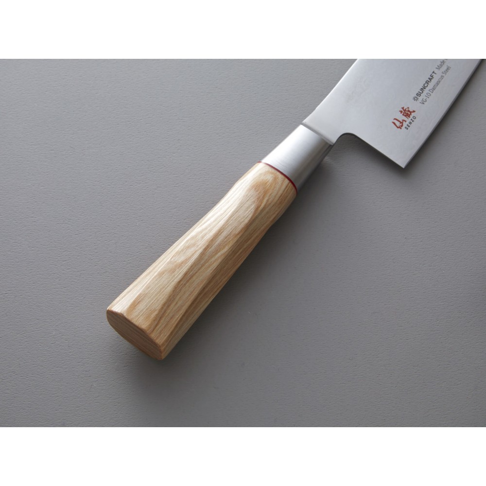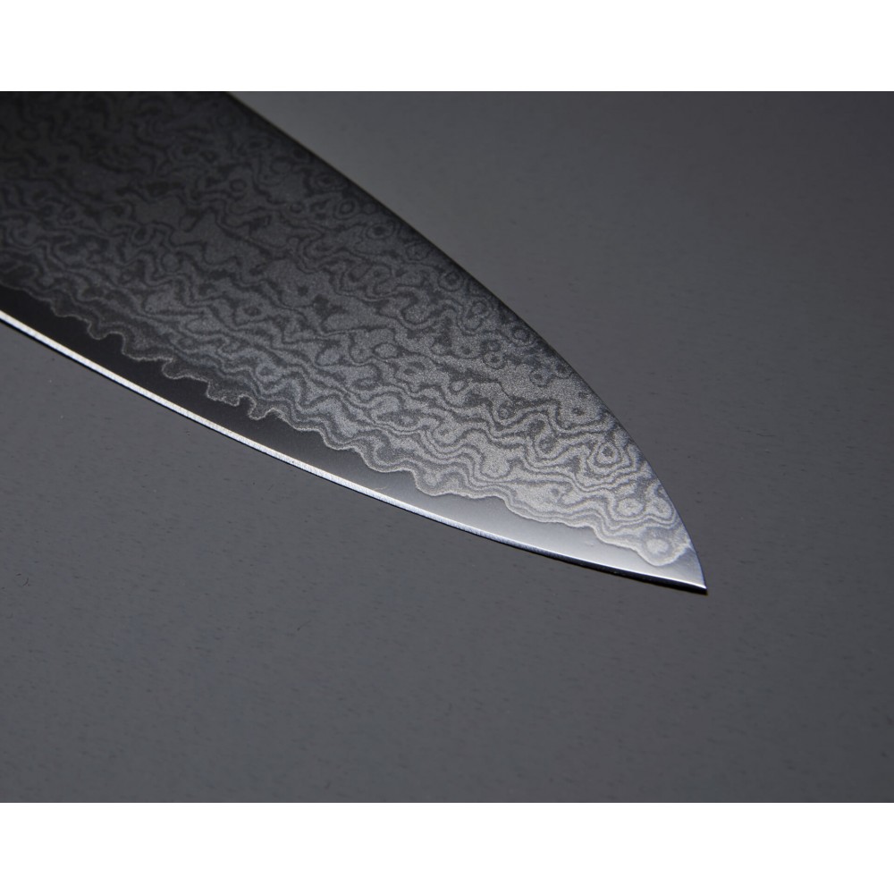 Japon çatal bıçak takımının geleneksel sekizgen sapından esinlenildi ve destek kısmına doğru biraz bükülme eklendi. Böylece parmaklar sap çizgisini daha sıkı tutar ve sapı daha rahat kavrayabilirsiniz. Şık beyaz pakkawood ve Şam çeliği deseni iyi uyum sağlar. Sekizgen şekli destek kısmına doğru biraz bükülmüştür ve sap destek kısmının etrafında yuvarlaktır. Sapı kavradığınızda parmaklar sap çizgisini daha sıkı tutar böylece kendinizi rahat hissedersiniz. Beyaz pakkawood ve kırmızı renkli halka japon tasarımını yansıtır. Çekirdek olarak VG10 çeliği bulunan 33 kat Şam çeliği, her bir bıçakta rastgele ve güzel dalga deseni oluşturmuştur.Özellikleri;