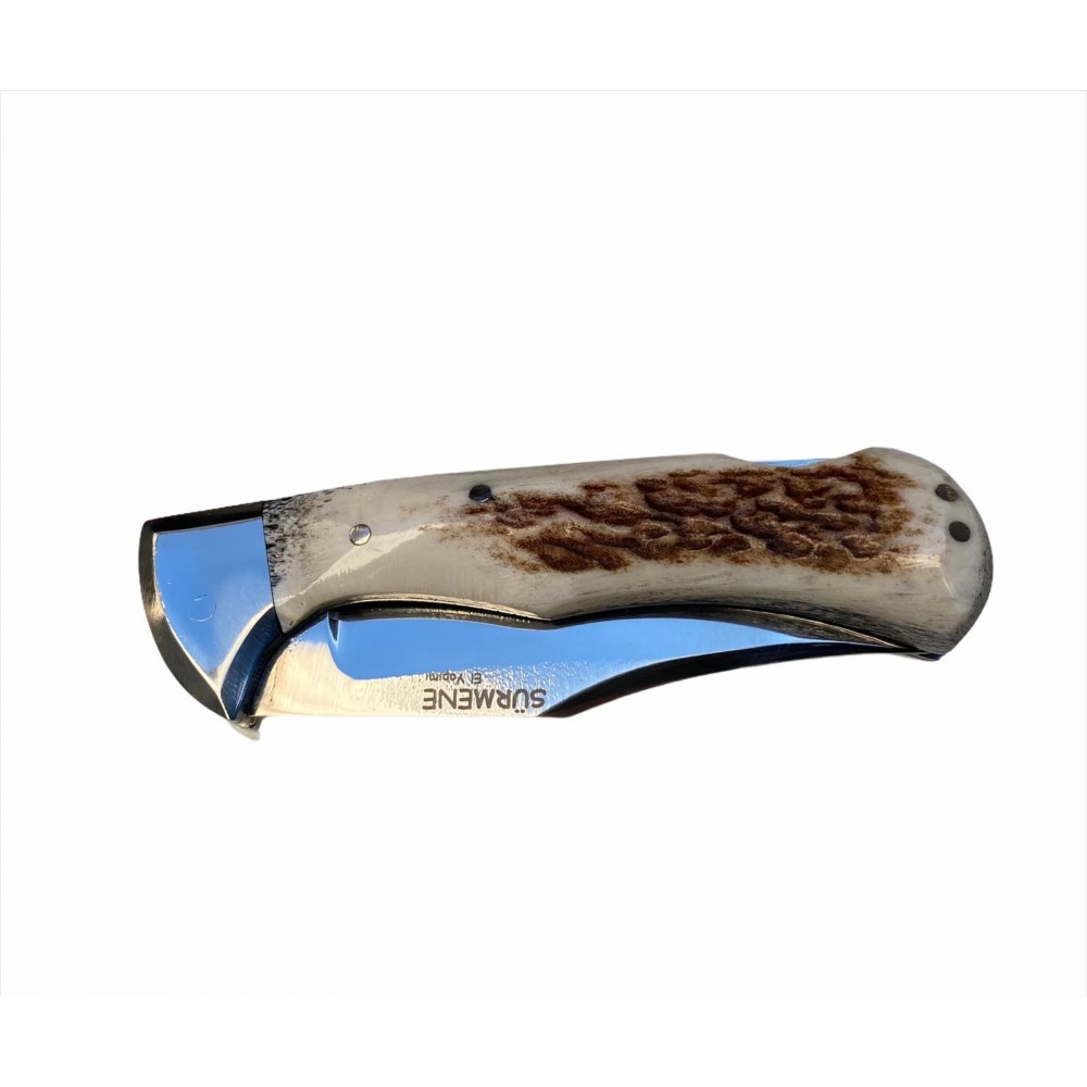 Sürmene 'nin bilezik ve kabzaya işlenmiş boynuz saplı çakıları sadece Bıçakçım.com 'da! Parlak paslanmaz kilitlenebilir bıçağı ve mükemmel işçiliğe sahip geyik boynuzu sapı ile çok şık ve kullanışlı bir çakı.