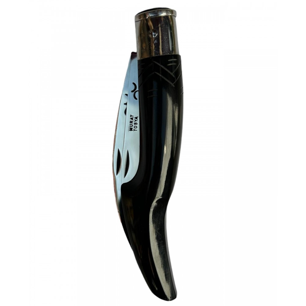 Sap kismi boynuzdur. Isitilip düzlendikten sonra keserle yontulur. Bileyi tasinda keser izleri kaybedilir. Eyelenir. Bilezik yeri testere ile kesilir ve eye ile düzelti lerek açilir. Paslanmaz çelikten ya pilan bilezik düzenli bir sekilde yerlestirilir. Ortalanarak delinir. Tasta bilezigin ve kemigin üst kis minin fazlaliklari alinir ve eye ile düzeltilir. Biçki ve çaki yüzlerinin yatagi testere ile elde açilir. Paslanmaz çelikten biçki ve çaki yüzleri kesilir. (Dövme çelik de olabilir.) Yüzler örste dövülür. Tasta sapa göre düzel tilir. Yani çalimi yapilir. Yüz kisminin delikleri delinir ve ayarlanir. Yüzlerin çekiç izleri tasa tutularak kaybedilir.